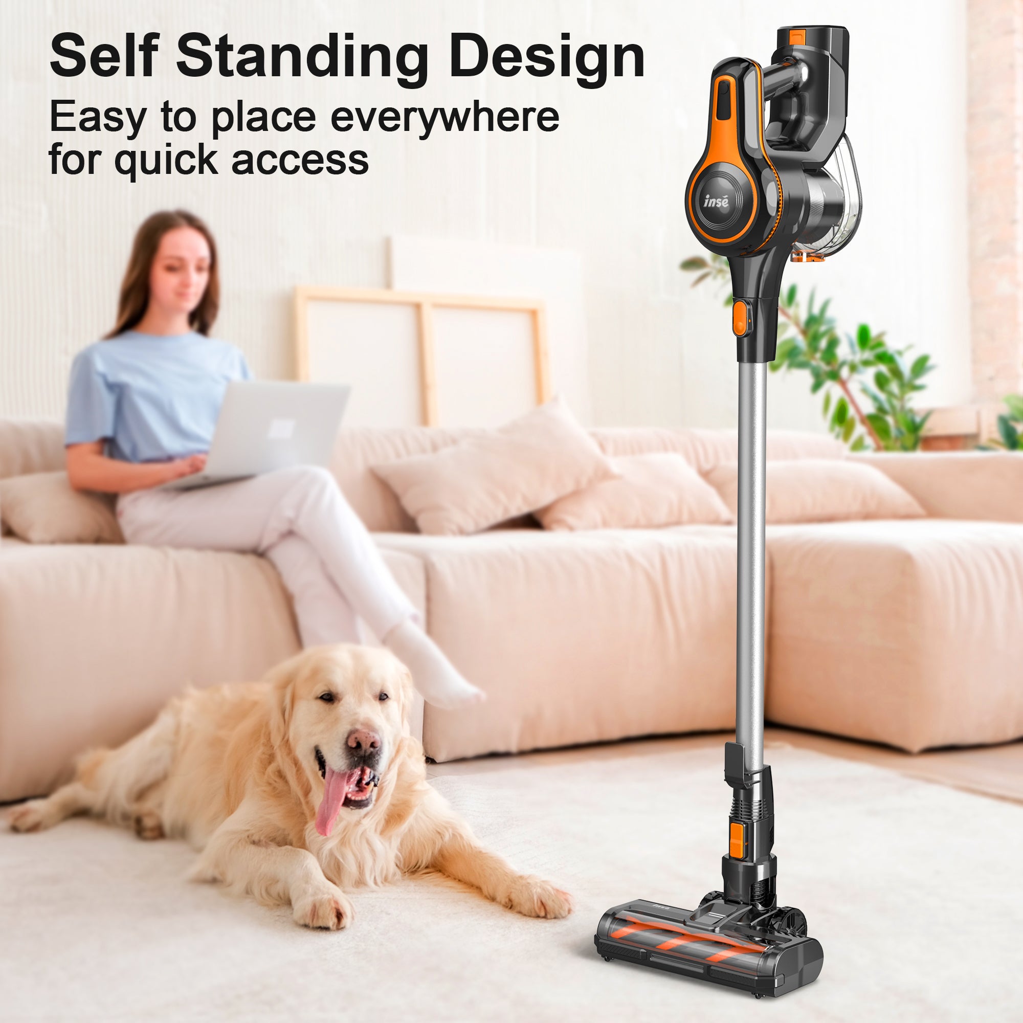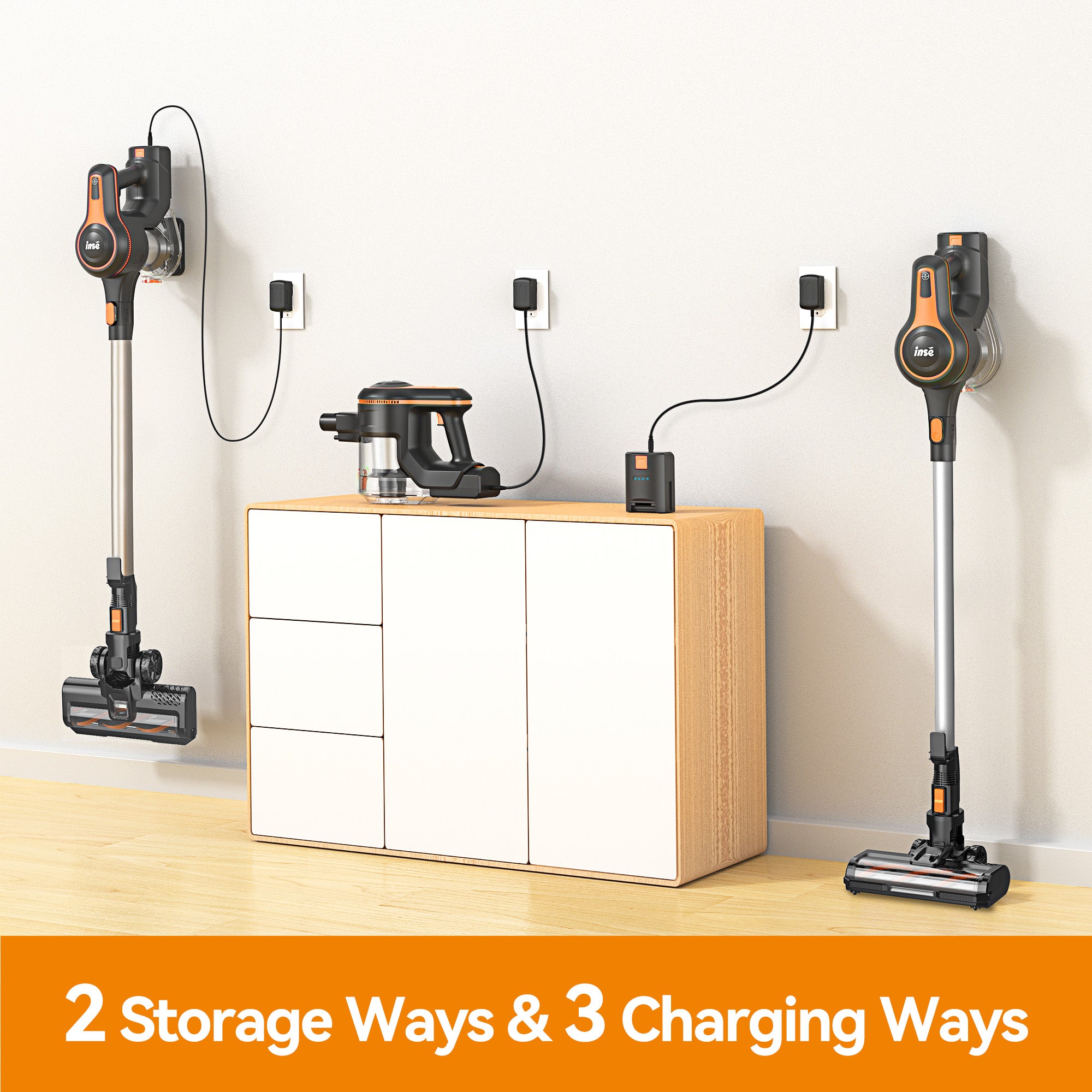 INSE Cordless Vacuum Cleaner features 40kPa powerful suction with 300W advanced digital motor.2500 mAh high-capacity battery provides 50mins long-lasting runtime.With A 5-stage cyclone filtration system, this Stick Vacuum Cordless Rechargeable could better keep the waste inside the bin, separate the dust and dirt from the air,and release fresh air out,a bonus for allergies. Comes with a brush attachment and a long crevice,INSE S620 Cordless Stick Vacuum can meet your various cleaning needs on the carpet, hard floor,rugs,cars,sofa,desk,drawer,cabinet,windows,curtain,and bookshelf,etc.And 8 LED lights of this Vacuum Cleaner illuminates every dark corner and helps to track dust.Self-standing design and compact wall-hanging design,which is effectively save space, and improve living comfort.The upgraded brush head,1.2L extra large dustbin and 5-stage cyclone filtration system make cleaning more efficient and convenient.