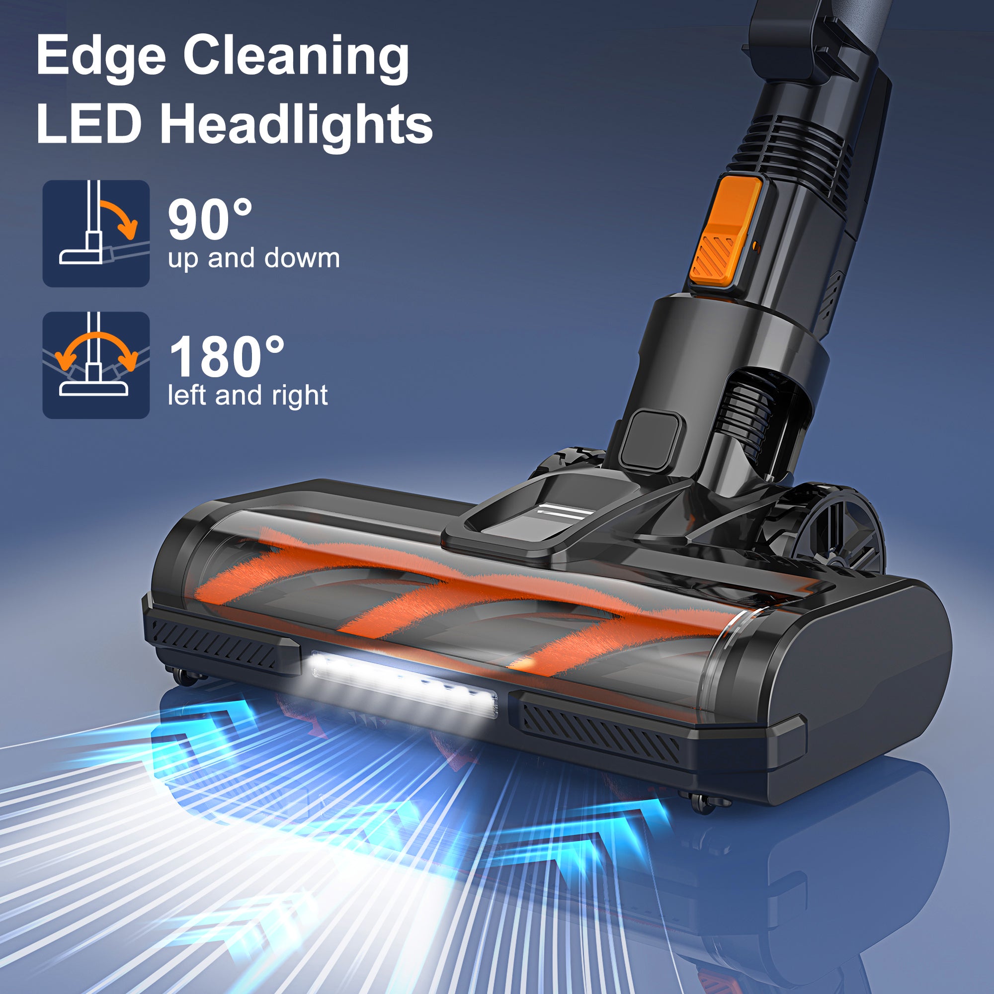 - Flexible Motorized LED Floor Head -- Extra-wide motorized floor brush with tangle-free design and big anti-scratch wheels provides easier clea-ning, LED light illuminates every dark corners and helps to track dust