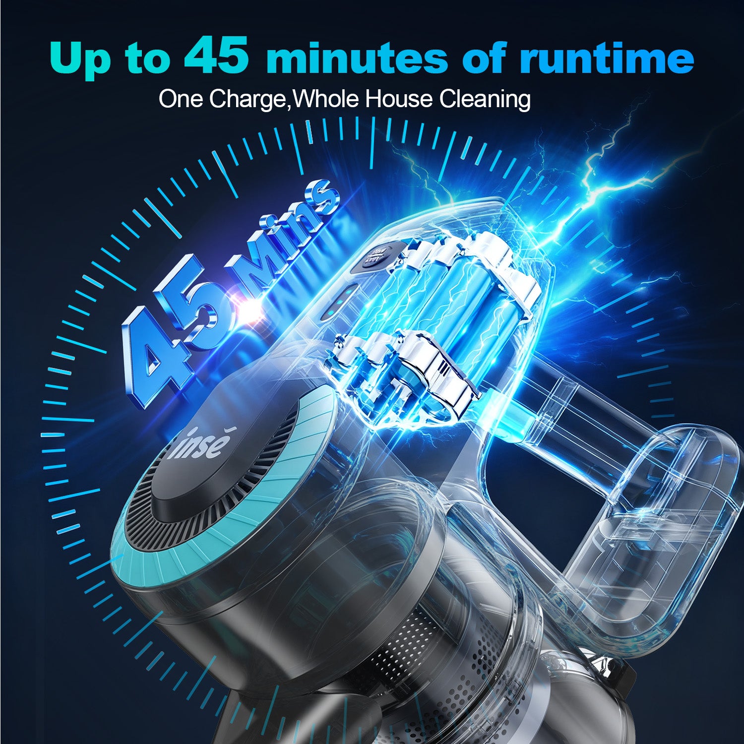 INSE N3P Cordless Stick Vacuum–Powerful,Lightweight & Smart Cleaning.Thanks to its slim build,the home vacuum cleaner swivels easily to reach under furniture and into tight corners.With two powerful suction levels, the cordless vacuum tackles deep cleaning on both carpets and hard floors,and its brush head effortlessly lifts debris while untangling stubborn hair.Despite its power, this pick weighs just under 2.2lbs, making it easy to even up stairs.Best of all,its cordless design gives you free rein to vacuum all over the house without being tethered to an outlet.With attachments,including crevice and brush tools,the rechargeable vacuum even converts from an upright model into a multifunctional handheld vacuum cleaner that makes jobs like removing pet hair from furniture, crumbs from car seats,and more so much easier.Another perk?4x search light reveals every speck on floors and carpets,tackle hidden messes and achieve a truly spotless clean.Charging the vacuum for 4.5 hours will ensure it’s ready for the next spill or for that last-minute vacuuming before company drops by.